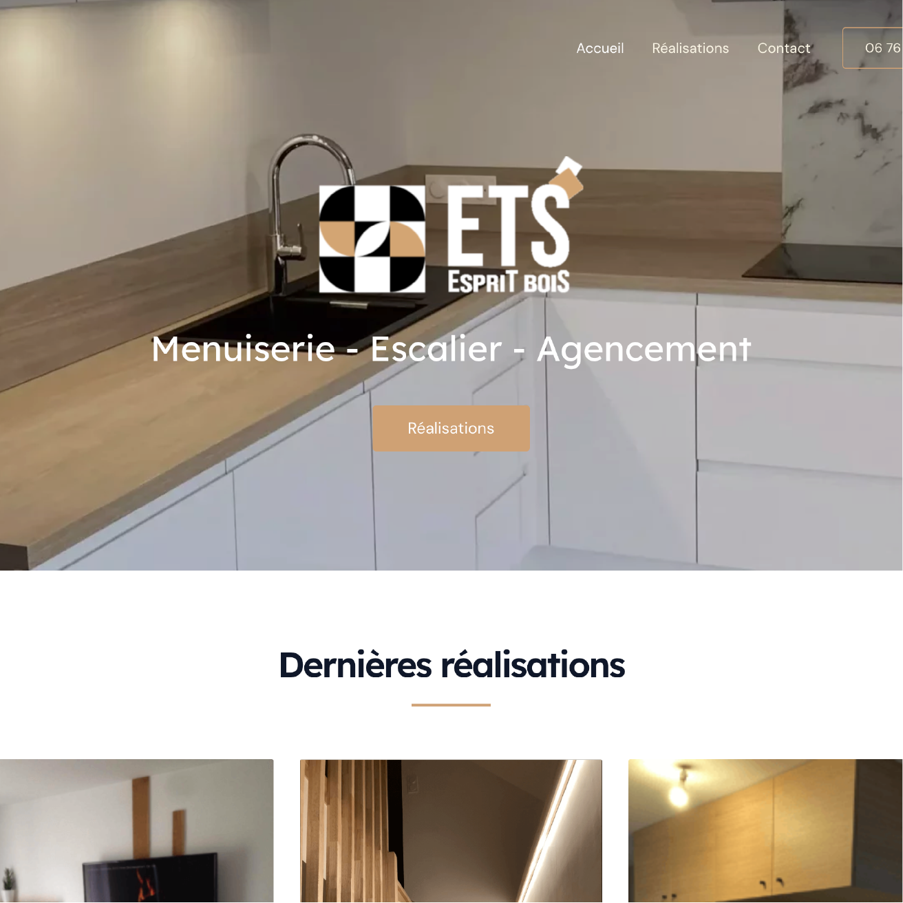 Thomas, artisan menuisier avec son entreprise Esprit Bois, souhaitait un site internet pour présenter ses réalisations et faciliter les demandes de devis. Il avait déjà un logo et une charte graphique existante.